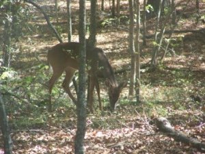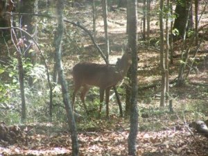 really cute. Later today I could hear Carolina (the dog) barking like crazy out side and I saw the car trying to come inside the house like something was after them. I took a look outside and saw a young deer standing in the back yard just standing tall and look right at the dog. I was not sure if it was going to run away or attack the dog. I did want any person living in the woods would have done. I ran in the house and grabbed the camera. (LoL did you think I was going for the gun?!? Heck no! I am not going to miss out on a good shot.)