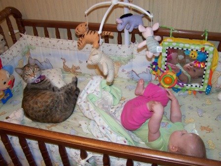 It seemed to be a okay day. Debbie off to work and Emily ready to play and eat. All is well. I got some work done in the yard today. It was not much but it was a little as much as I could with Emily taking a nap and the cats and dog bugging me. Well I was working in the yard I left one of the doors cracked and when I came back to get emily up for lunch I notice Emily was having a party. The Cat jumped in the crib with her and was sleeping at the foot of her crib while Emily was just playing as happy as she could be. I took the cat out and by the time I get back she was turned over and playing with her toys in the crib.
